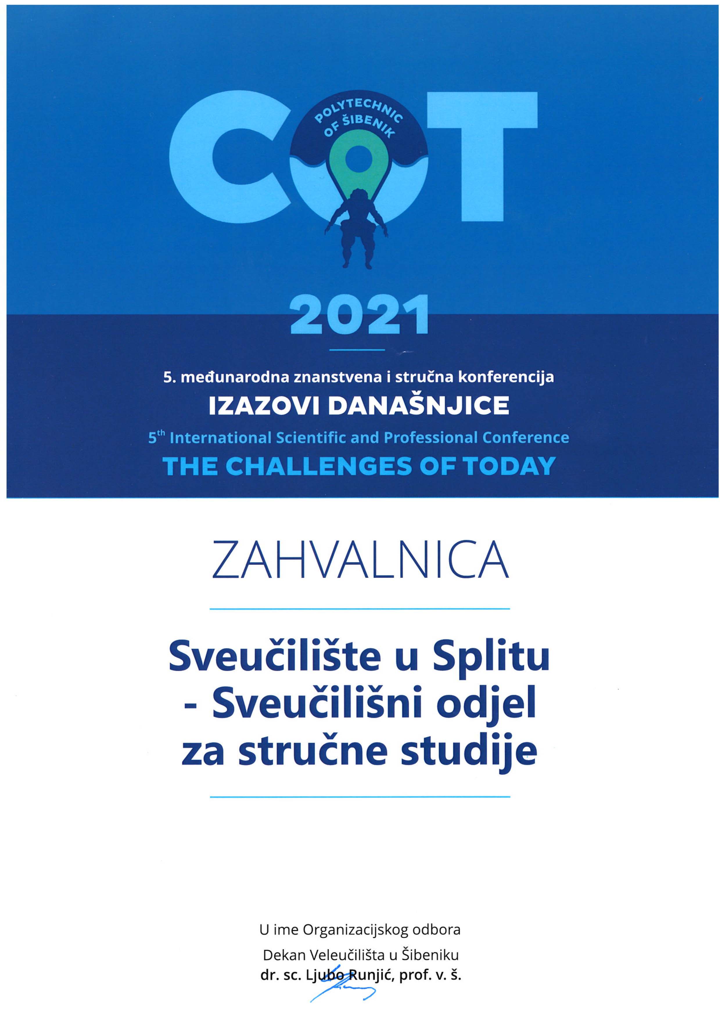 Za izniman doprinos u organizaciji i provedbi 5. međunarodne znanstvene i stručne konferencije IZAZOVI DANAŠNJICE (COT 2021), Veleučilište u Šibeniku dodijelilo je zahvalnicu Sveučilišnom odjelu za stručne studije.