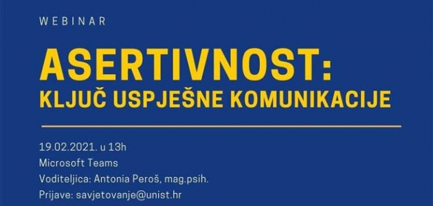 Ured za upravljanje karijerama Sveučilišta u Splitu organizira online radionicu u skopu 14. Tjedna psihologije na temu ''Asertivnost: ključ uspješne komunikacije''. Asertivnost nam pomaže da zadržimo i učvrstimo naše samopoštovanje te u mnogim situacijama dobijemo ono što želimo. Isto tako, omogućava nam izgradnju zdravih odnosa s drugim ljudima, povećava sposobnost suočavanja sa sukobima i kritikom, razvija toleranciju i omogućava da konstruktivno reagiramo na tuđu ljutnju. Kroz teorijski i praktični dio radionice studenti će imati priliku osvijestiti svoj stil komunikacije te uvježbati pojedine tehnike asertivne komunikacije.